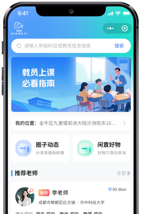 家教小程序,可以进行身份切换,发布需求,老师接单,双方自行联系,还带有社交属性(发布闲置、评论、消息提醒、点赞)适合初次创业尝试使用,整个小程序前后端功能完整,有源码,可授权部署。