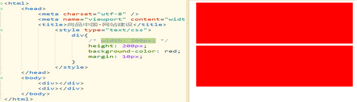 试着再添加一个div标签,加入margin-bottom下边距,区分他们的位置,接下来把宽度去掉,可以看到宽度变宽了,从浏览器的左边到右边,现在有两个红色块逐行显示仿佛表现的很霸道,如下图:
