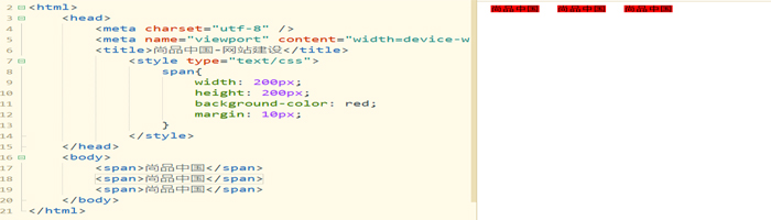 用span标签为例,添加三个span标签,设置”宽高200px 背景颜色红色 margin10px“样式, 发现并没有按200*200去展示 ,margin标签对上下并没有改变,对比块元素由此得知: