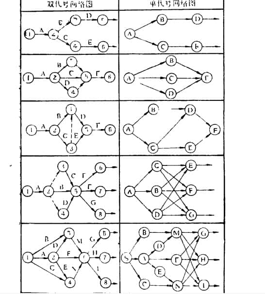 根据网络规划的最终目标,可分为单目标网络图和多目标网络图两大类。单目标网络图的最终目标只有一个,比如某栋楼的建造、某新产品的试制、某设备的维修等,多目标的最终目标有几个客观的网络图,比如同时生产几种不同类型的产品,完成某个建筑群的建设任务等。根据网络图中运行时间的预估性质,可以分为两种类型: 肯定型和非肯定型。确定性网络是指每个操作时间可以估计的所有值,而非确定性网络是指很难估计每个操作时间的准确值,分别是最短、最长和最可能的三个持续时间估计的。然后计算加权平均工作时间。下面是单双码网络图的对比分析。