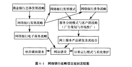 在网络银行项目规划中,首先要确定商业银行的总体发展战略,这是项目规划所有内容的基础和前提。只有在此基础上,才能最终确定网上银行的发展战略。确定了网上银行的发展战略后,根据战略确定网上银行的客户群战略、服务布局战略和电子商务战略,最后确定产品设计和业务组合战略。网上银行战略项目规划的操作内容和流程见图4-1。一般只有在确定产品设计和业务组合后,才能确定其他相关的辅助服务,如技术支持(选择外购或自主开发等)、人力资源管理,最终确定日常运营管理模式和系统维护模式网上银行。可粗略估算维持网上银行项目持续经营的总成本和单位平均成本,进而估算网上银行投资结构及其投资回报率,最终形成对网上银行投资风险及其控制的研究,从而完成网上银行战略。项目规划的整个方案。