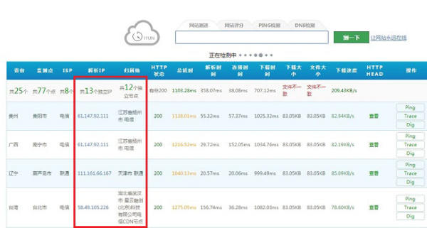 下面主要教大家如何借助在线工具测试网站是否开启CDN,并且可以测试出全国不同地区,访问该网站的速度与访问IP地址。这里为大家推荐2个在线测试网站全国访问速度工具,通过这些工具,不仅可以轻松查出网站是否开启CDN,还可以测试全国不同地区的房访问速度。