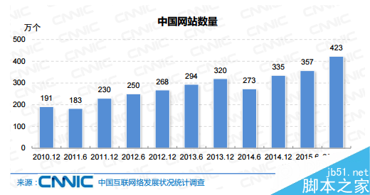 据中国互联网络信息中心(CNNIC)1月22日发布的第37次《中国互联网络发展状况统计报告》中数据显示,截至2015年12月,中国网站总数为423万个,年增长 26.3%,其中“.CN”下网站数为213万个。