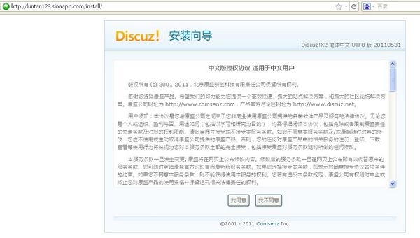 3 Discuz!X安装 3.1安装 访问安装链接http://appname.sinaapp.com/install/ ,把appname改成你应用二级域名的前缀。我刚才建的是luntan123,所以接着输入