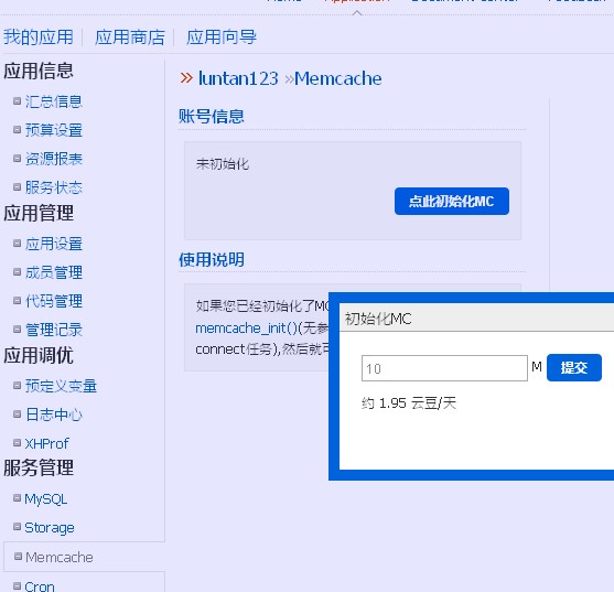 1.2初始化数据库 登陆你的SAE应用管理后台,点击mysql,初始化数据库。