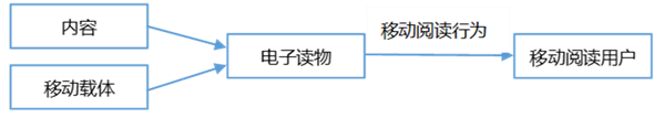 从移动阅读组成要素来讲,主要有三个:移动阅读用户(主体)、电子读物(由内容和移动载体组成的客体)、行为(用户的态度与行为表达),如下图所示。