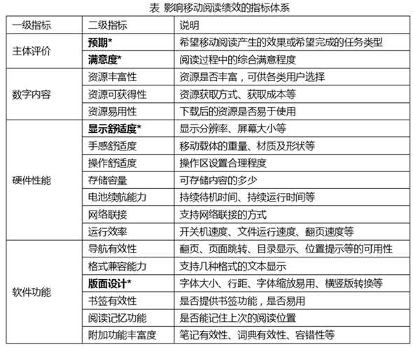 1.2 影响移动阅读绩效的指标 有关影响移动阅读绩效指标的研究很多,相关指标主要可以分为四类:主体评价、数字内容、硬件性能、软件功能(详见下表)。