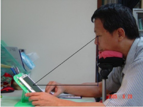 B.文字最小可接受的视角 通常由字号大小与阅读视距决定,实验室测量方法如下图所示。在电子书阅读测试中,针对接近正方形的中文字(即,字高等于字宽),一般可接受最小视距为30cm以上,适当视距为50cm。青年组(20-35岁)“字高”至少为4.8mm(24pt),中年组(36-50岁)至少为5.14mm(25pt)。当固定近似正方形中文字体的字高4.85 mm与行距3 mm,字元间距为0.61 mm 或1.21 mm会有较好的绩效,而且也不会增加视觉疲劳[2]。