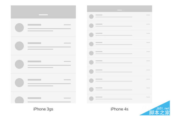 再用iPhone 3gs和4s来举例。假设有个邮件列表界面,我们不妨按照PC端网页设计的思维来想象。3gs上大概只能显示4-5行,4s就能显示9-10行,而且每行会变得特别宽。但两款手机其实是一样大的。如果照这种方式显示,3gs上刚刚好的效果,在4s上就会小到根本看不清字。