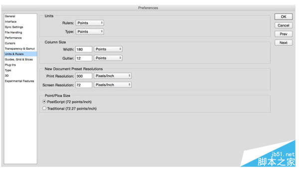 之前我说过,我们要以逻辑像素尺寸来思考界面。体现到设计过程中,就是要把单位设置成逻辑像素。打开PS的首选项——单位与标尺界面,把尺寸和文字单位都改成点(Point)。这里的点也就是pt,无论设计iOS、Android还是Web应用,单位都用它。当然,各平台单位名称还是要记住的。这里我们用的只是它的原理,不用在意名称。