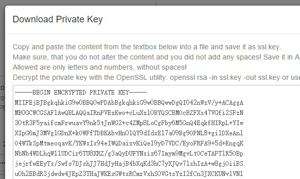 这里我们输入10位以上的密码,让系统给我们自动生成CSR,这里我们一定要记住密码,后面估计获取SSL的时候需要用到。