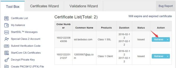 我们可以看到StartSSL证书后台还是比较清晰的,一般的工具我们不需要用到,如果后面小编在实际用途的时候需要用到在补充。这里我们需要做的就是将证书下载下来。默认是免费1年,到期之前是可以续约的,也是免费的。