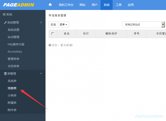 网站有各种各样的需求,不同的网站需要保存的信息都不一致,如企业网站需要有产品表,新闻表,但学校网站需要新闻表,学生报名表等,自定义信息表很好解决这种需求,自定义信息表和自定义字段为PageAdmin的核心功能,可以在系统>表管理中进行添加,如下图: