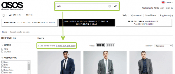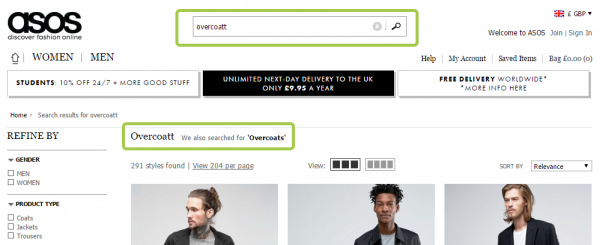相反,Asos 在这方面就做的很好,当输入错误发生的时候,他们会尽量以无侵略性的方式来帮助客户,比如“您的初始搜索为Overcoatt,我们也为您搜索了Overcoats的相关结果”。