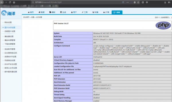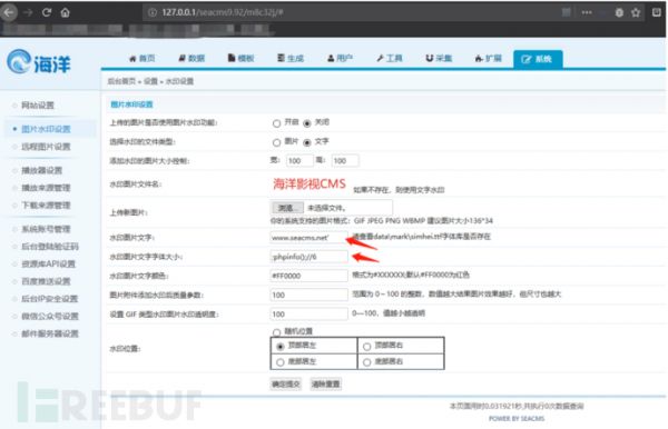 有了网站后台管理员权限,一般都会想上传webshell,那么后台我们在代码的安全审计中发现有一处漏洞,可以插入php语句并拼接导致可以上传网站木马文件,在水印图片文字功能里,接收图片的注册值时可以插入phpinfo并执行,如下图。