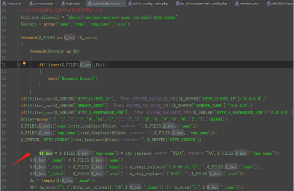 我们SINE安全工程师对该代码进行了详细的安全审计,在一个变量覆盖上发现了漏洞,一开始以为只有这一个地方可以导致网站漏洞的发生,没成想这套系统可以导致全局性的变量覆盖发生漏洞,影响范围较大,seacms系统的安全过滤与判断方面做的还不错,在其他地方放心可以平行越权,并直接登录后台是管理员权限。默认变量覆盖这里是做了安全效验的功能,在配置代码里common.php的22行里可以看到对get,post,cookies请求方式上进行了变量的安全效验,对代码的安全审计发现在34行里的变量覆盖值判断没有进行KEY值的安全限制,导致此次漏洞的发生,我们可以利用这个值进行全局的变量覆盖,不管是seeion还是cfg值都可以覆盖。