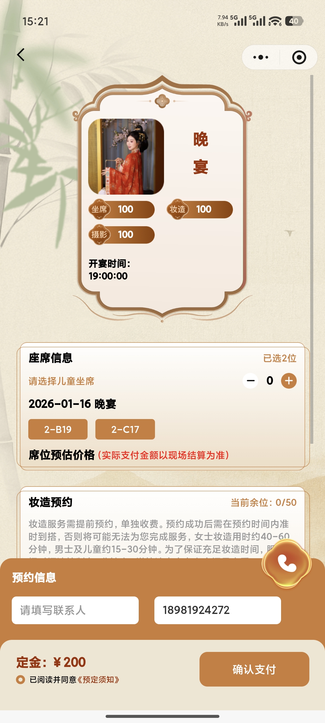 酒店在线订座、到场核销、定金支付、包间预定、订单核销、妆造摄影预约等功能。